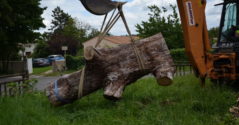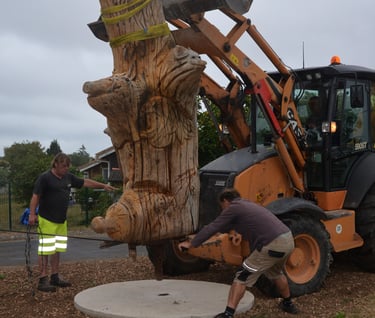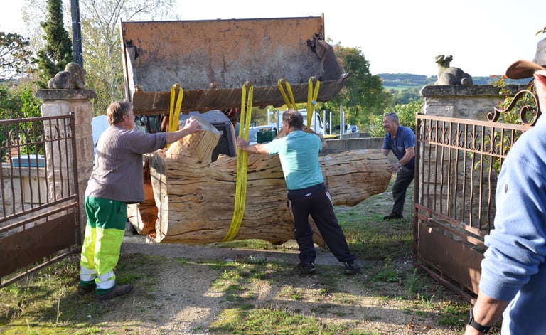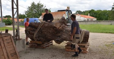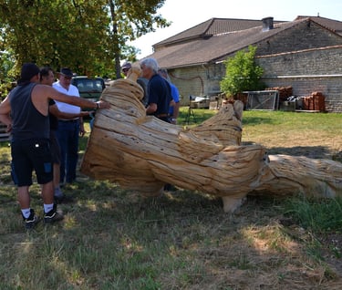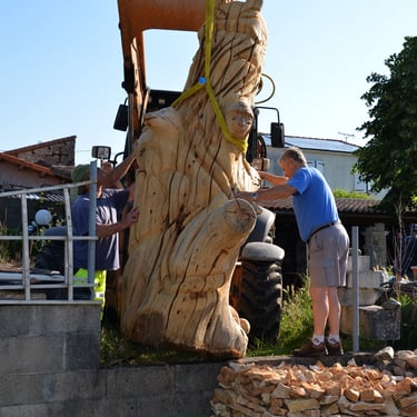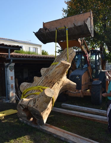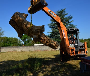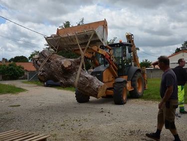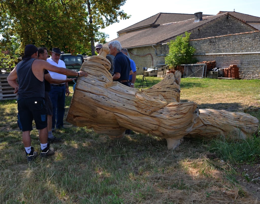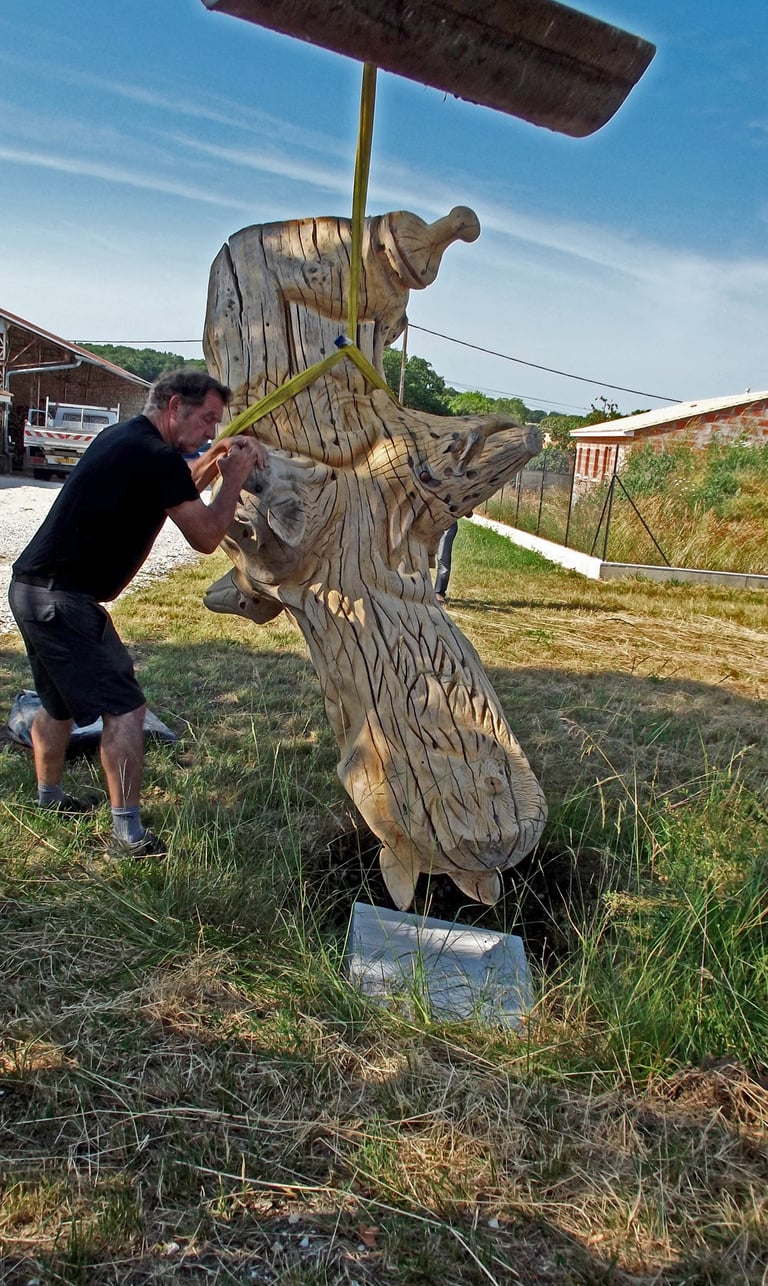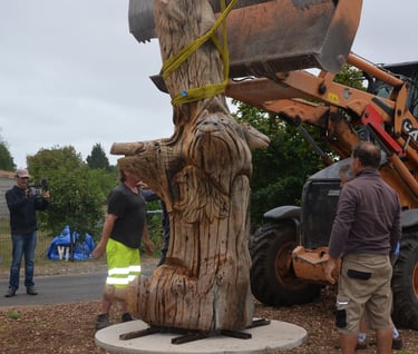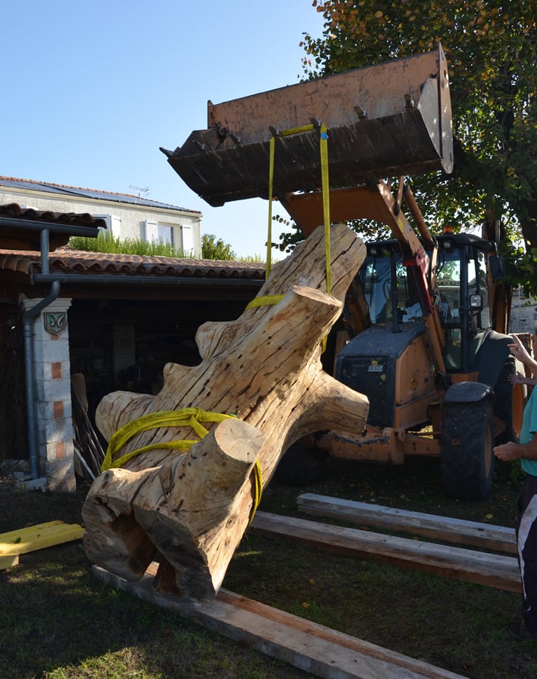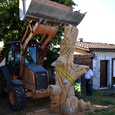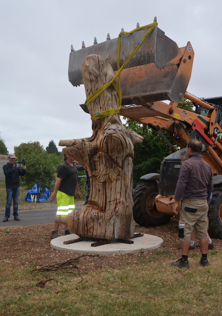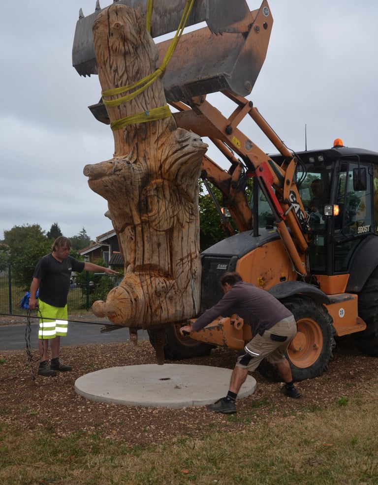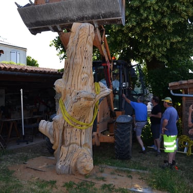 Après 2 h de manipulations intenses des employés communaux et des bénévoles, le tronc, qui à ce stade là pèse environ 3 tonnes ,se trouve enfin bien en place, debout, prêt à être travaillé par les mains expertes du sculpteur Mano....