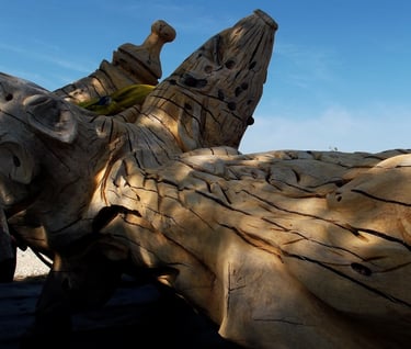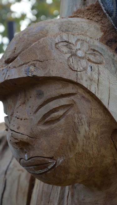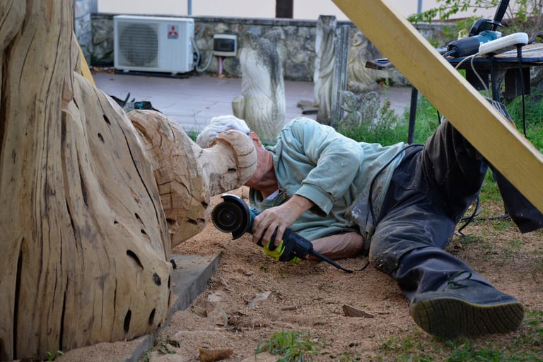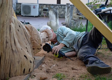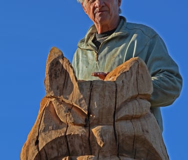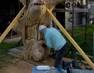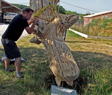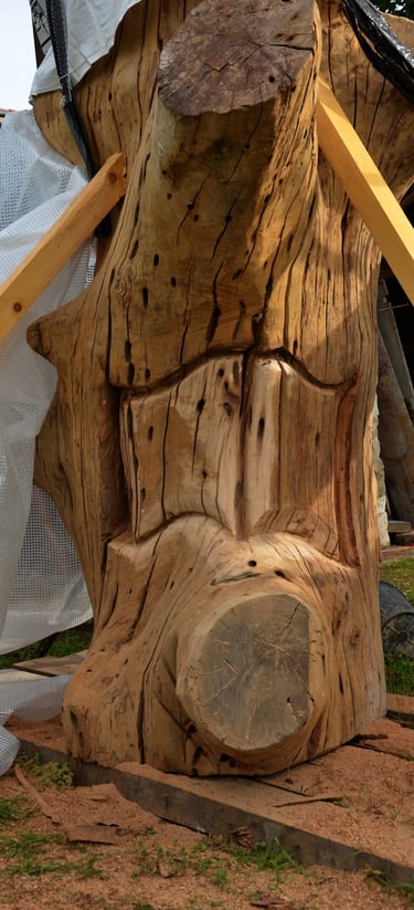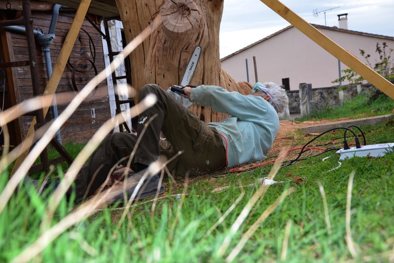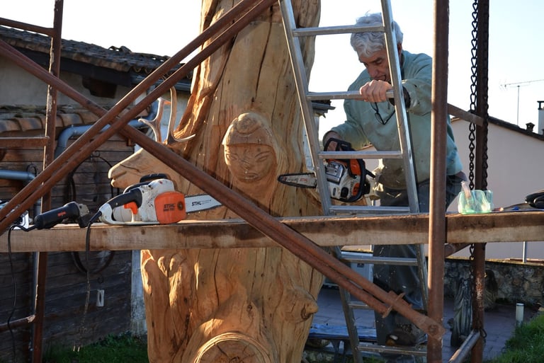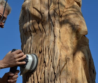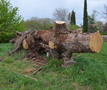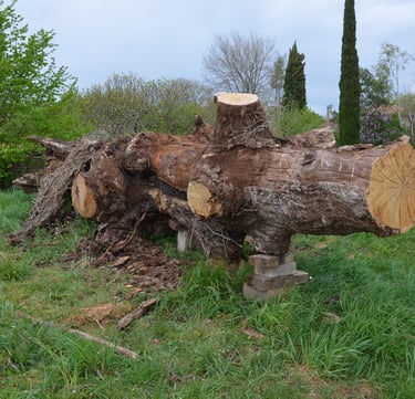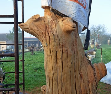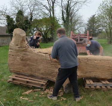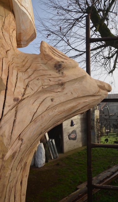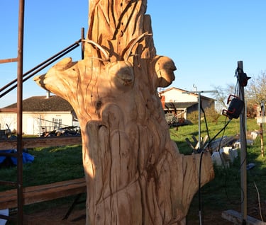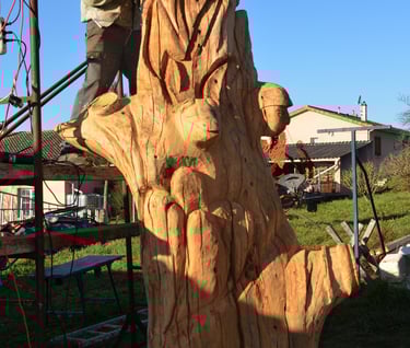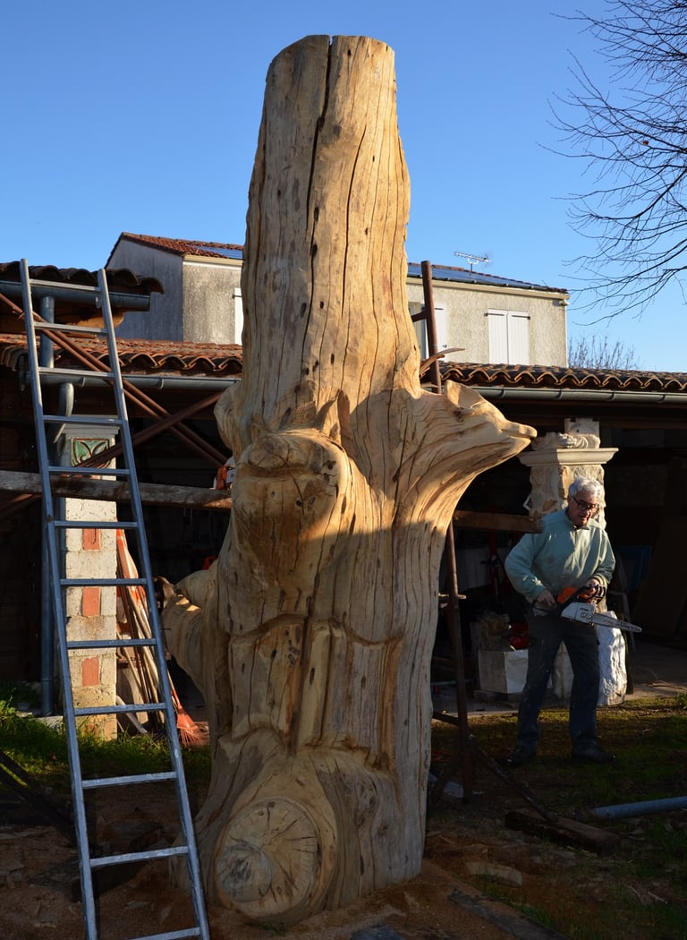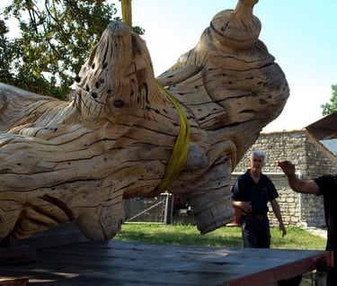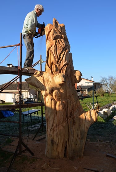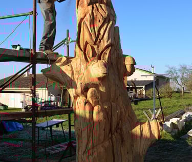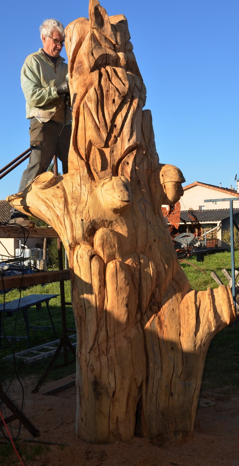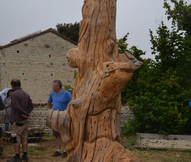 Après 2 h de manipulations intenses des employés communaux et des bénévoles, le tronc, qui à ce stade là pèse environ 3 tonnes ,se trouve enfin bien en place, debout, prêt à être travaillé par les mains expertes du sculpteur Mano....