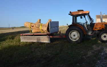 De bon matin, le chêne est chargé sur la remorque et convoyé jusqu'au lieu-dit : Les Gendres